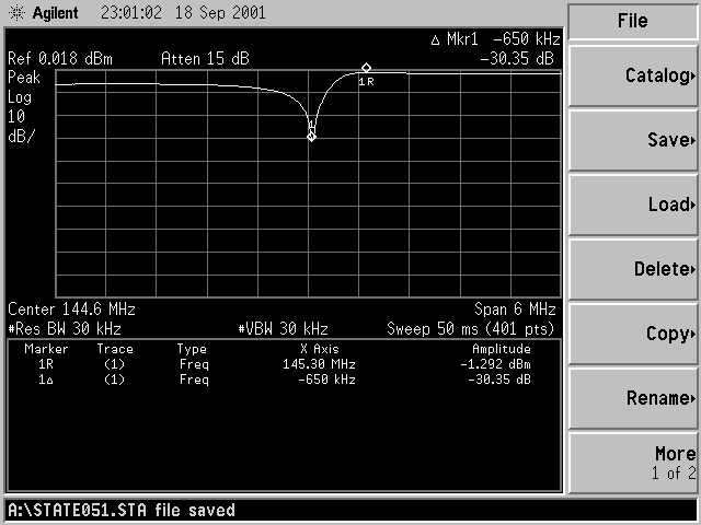 Характеристику коаксиального резонатора для диапазона 2 м можно исследовать с помощью анализатора спектра со встроенным ГКЧ. Частотами повышенного интереса для нас должны быть: частота линейного входа репитера (частота приёмника) и частота выхода репитера (частота передатчика), для которых, собственно, и модифицируются резонаторы. Испытательный стенд содержит генератор с 50-омным выходом, сигнал с которого подаётся на петлю связи резонатора, к петле связи (другой, выходной) подключен анализатор спектра для контроля. (Обычно, эти дела решаются использованием одного прибора измерителя частотных характеристик, сокращённо, ИЧХ, ну, да, ладно-идём далее – UA9LAQ).