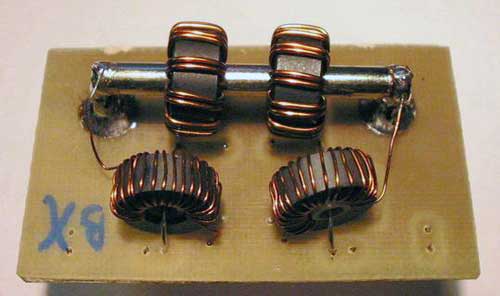 Прибор не реверсивный, поэтому надо соблюдать правильность включения входа и выхода. Трансформаторы L1 L2 намотаны на ферритовых кольцах типоразмер 12x7x6 мм проводом пэв-0.4мм 22 витка, мотается равномерно по всей окружности кольца. Затем в оба намотанных кольца вставляется латунная трубка диаметром 3,5мм и длинной 40 мм (я использовал элемент антенны от карманных приёмников) и распаивается на разъемах PL. Образец приведён на фотографии.