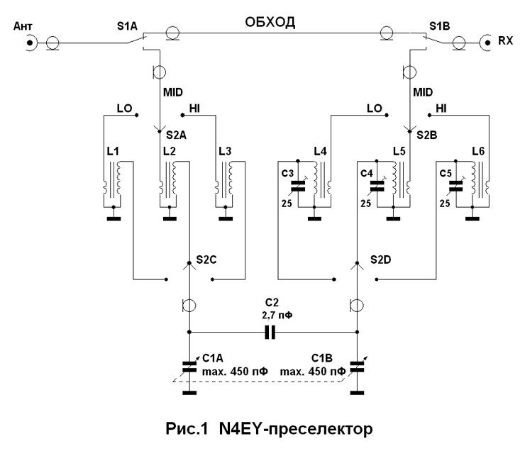 В 1993 году преселектор по схеме N4EY (Рис.1) был изготовлен на радиостанции EW1MМ (Фото 1) и подробно описан в [2].