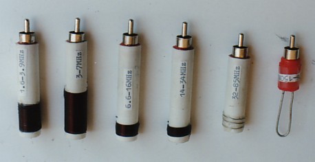 Пластиковая ручка штеккера RCA удаляется, и резистор припаивается непосредственно к выводам штеккера. Выводы катушек обрезаются с небольшим запасом, зачищаются, облуживаются и припаиваются также к выводам штеккера, дальний от штеккера конец катушки припаивается к центральному проводнику, ближний – к внешнему кольцу штеккера. Штеккер вставляется в трубку настолько, насколько он туда войдёт, так чтобы не закрыть контактную поверхность (трубка – каркас катушки заменяет снятую пластиковую ручку штеккера – UA9LAQ). Если необходимо, то внутренность основания трубки заполняется вяжущим герметиком для обеспечения жёсткости крепления трубки к штекеру. Имеющийся у меня штеккер RCA старой конструкции подошёл к трубке без проблем, но новые, - меньшие по диаметру хвостовика, - требуют заливки-уплотнения.