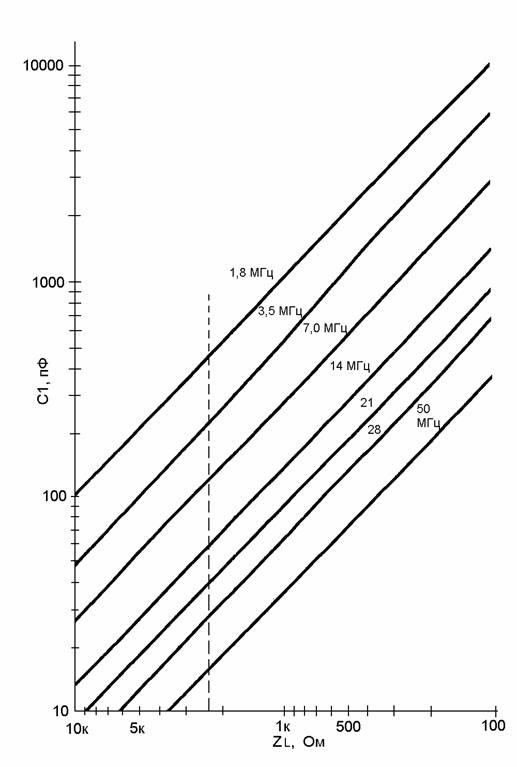 Значения компонентов П-контура в зависимости от импеданса анодной нагрузки