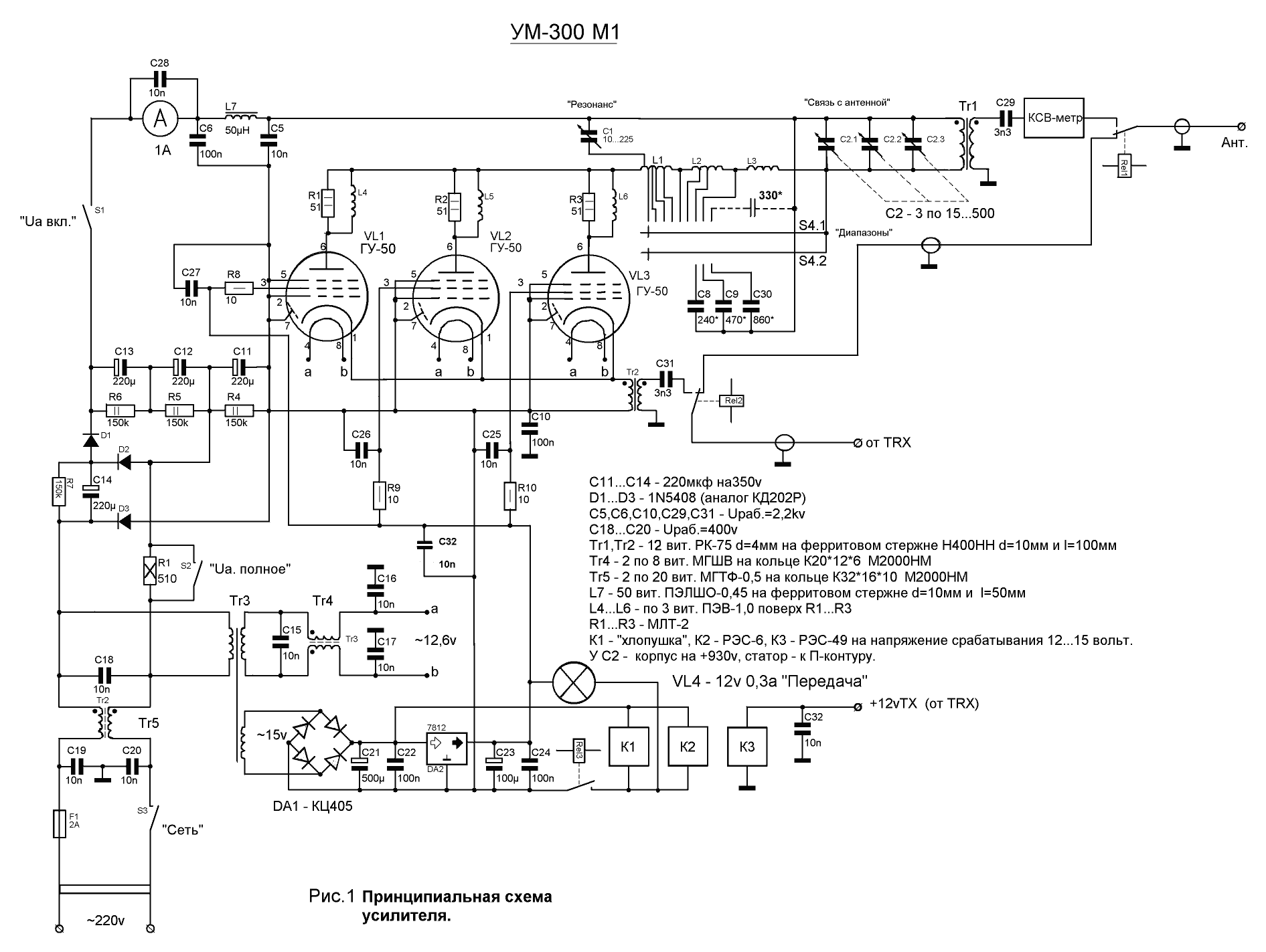 К созданию этого усилителя мощности для КВ трансивера меня побудили небезизвестные публикации таких известных авторов, как Я.Лаповок (UA1FA) и И.Гончаренко (DЛ1TT). Задачей ставилось изготовление лёгкого, малогабаритного и мощного РА, но использование общепринятой методики не позволяет выполнить все эти требования. Кроме этого, РА с параллельным питанием требует очень тщательного выполнения анодного дросселя, и его «отдача» на ВЧ диапазонах сильно зависит от его собственной ёмкости и от ёмкости монтажа, т.е. его КПД снижается. Схема с последовательным питанием во многом свободна от этих недостатков, правда предъявляет повышенные требования к качеству монтажа и к электрической прочности применяемых радиоэлементов. Но согласитесь: лучше немного больше, чем обычно, затратить времени, сил и средств, но в итоге получить добротное изделие, над которым не придётся всё время трястись с паяльником или надрывать живот, пытаясь его сдвинуть с места по мере надобности.