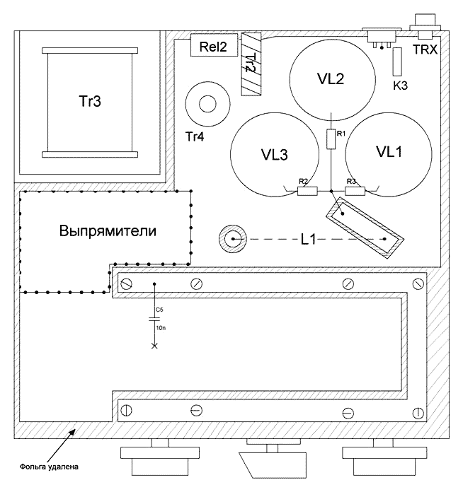 Что касается технологии: оптимальный вариант – выполнение всего монтажа на цельном куске одностороннего фольгированного стеклотекстолита. Все монтажные дорожки выфрезерованы, а остальная фольга служит общим проводом. В местах крепления к корпусу фольга тоже удаляется, на ширину не менее 5мм от металлических деталей. Все КПЕ крепятся на этот же текстолит, с удалением фольги вокруг болтов крепления, а ручки, через пластмассовые втулки, выводятся на переднюю панель.