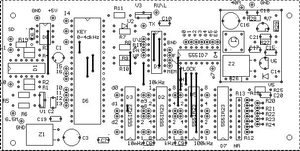 Основу схемы составляет однокристальный микроконтроллер АТ89с51 фирмы ATMEL из семейства MCS-51. На микросхеме D1 собран формирователь сигналов валкодера. На микросхеме D9 собран формирователь сигналов клавиатуры . Микросхема D8 - энергонезависимая память. D2-D7 - формирователи управляющих кодов синтезатора. На транзисторах V6,V7 собран второй гетеродин на частоту 40 мГц. Управление по частоте осуществляется при помощи ЦАП на резисторах R12-R25. На транзисторе V1 собран формирователь сигнала третьего гетеродина. При помощи ключа на транзисторе V3 производится управление реле, переключающего третий гетеродин.