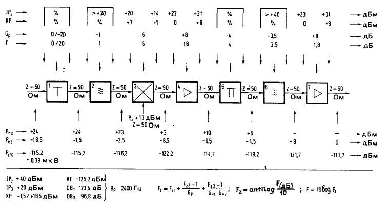 Четыре верхних строки цифр на этом рисунке представляют значения параметров IР3, КР, Gp и F для семи функциональных блоков; в двух следующих строках (в нижней части рисунка) указаны допустимые значения мощности широкополосного сигнала Phs и мощности полезного сигнала Pes в узлах сопряжения блоков; в самой нижней строке для сравнения приведены узловые уровни мощности полезного сигнала Рс10 при отношении сигнал/шум 10 дБ. Резюме по техническим характеристикам рассматриваемого широкополосного тракта и некоторая другая важная информация содержатся в самой нижней части рисунка.