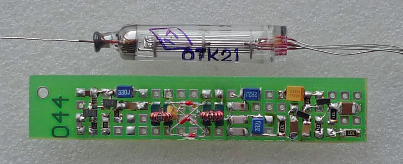 В окончательном варианте прибора автор все-таки заменил узел смесителя на лампе Л3 кольцевым смесителем на диодах. Новый узел содержит простой усилитель-формирователь на двух СВЧ транзисторах 2SC3356, смеситель на диодах КДС523ВР, ФНЧ с частотой среза 15 МГц, и выходной усилитель на относительно низкочастотных (для дополнительного подавления сигнала частотой 60 МГц на выходе) транзисторах КТ3130 с граничной частотой 150 МГц. Оба усилителя собраны по той же схеме, что и корректирующий усилитель на 2Т316 (см. выше), с отличиями лишь в номиналах использованных резисторов. АЧХ настроенного узла практически линейна (с погрешностью менее 10%) в диапазоне частот начиная от 1 КГц и выше вплоть до выбранной частоты среза ФНЧ (индуктивности по 2.2 uH, емкости по 100 pF и 200 pF в середине; расчетное сопротивление ФНЧ 100 ом). Изготовленный узел смесителя показан на фото рядом с лампой 1Ж37Б для сравнения. Разумеется, этот вариант смесителя сложнее в исполнении, чем первоначальный (кстати говоря, можно было бы и не возиться с SMD компонентами и микроскопом, а просто попробовать улучшить АЧХ исходного лампового смесителя путем устранения паразитных емкостей в цепи анода лампы, о чем будет сказано ниже).