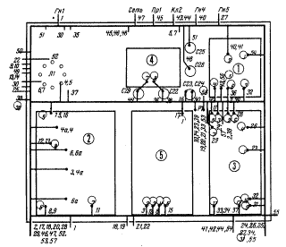 В анодную цепь лампы первого смесителя включен трехконтурный перестраиваемый фильтр сосредоточенной селекции (ФСС) 5-Ll—5-L5, 5-С2—5-С9, настроенный на первую промежуточную частоту (6—6,5МГц). Гетеродин плавного диапазона (ГПД) работает на транзисторе 5-Т2 на частотах 5,5—6 МГц. Буфер-усилитель на транзисторе 5-T1 служит для уменьшения влияния смесителя на частоту задающего генератора. Контур ГПД 5-L7, 5-С20 настроен на частоту 5,75 МГц. Он зашунтирован резистором 5-R16 для получения равномерного коэффициента передачи. Напряжение ГПД, подаваемое на катод лампы 5-Л1 второго смесителя, может устанавливаться подбором делителя 5-С23, 5-С24 либо шунтирующего резистора 5-R16.