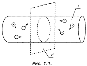 “А”: Все правильно, но ведь я спрашивал, Незнайкин, об электрическом токе! А нюанс здесь такой... Электроны, действительно, беспорядочно движутся внутри кристалла. И скорость их довольно велика. Она зависит, в , значительной степени от температуры кристалла. При комнатной температуре средняя скорость электронов составляет несколько метров в секунду! Но представим себе некий кусок металла в виде отрезка проволоки, например, медной... Впрочем, давай лучше изобразим это на рисунке (рис. 1.1).