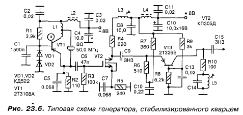 “С”: Да вот, посмотрите на рис. 23.5. Для возникновения колебаний необходимо, чтобы колебательный контур был настроен на частоту кварцевого резонатора. Но можно выбрать частоту колебательного контура как ЦЕЛОЕ КРАТНОЕ резонансной частоты колебаний кварца и возбудить, тем самым, резонатор на соответствующей КРАТНОЙ ГАРМОНИКЕ!